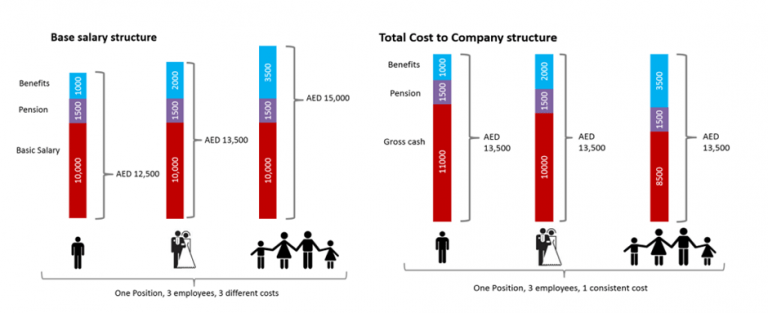 The fundamental premise is that the company decides what the value of a role is, irrespective of who fulfills that role. Simply put, the total cost of employment that they are prepared to pay for the Project Manager position is AED 500,000 per annum, irrespective of the marital status and family size of the incumbent.