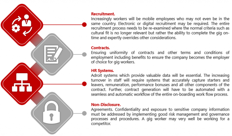 Each company, sector and industry is unique and the Gig Economy will affect each in a very different manner. There is therefore no panacea or magic bullet to guide HR professionals however operational factors which must be implemented would include inter alia: