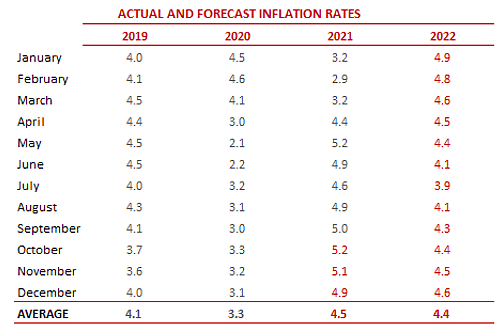 Our inflation forecast is slightly higher than the South Africa Reserve Bank’s (“SARB”) forecast of 4.2% although the SARB did state at the September 2021 meeting that, “The risks to the short-term inflation outlook are assessed to the upside”. We are a little concerned that even our higher forecast may be too low given rising global producer prices, the supply chain constraints, food price inflation, higher oil prices, electricity and administered price increases, higher domestic import tariffs, and union demands for higher wages.