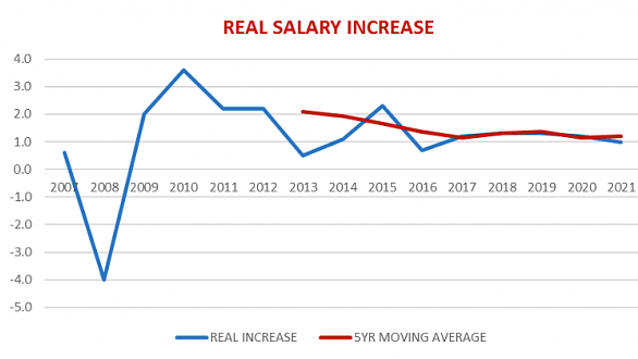 The historic methodology adopted in South Africa, when determining an equitable salary increase in the past, was to add a 2.0% real increase to the forecasted inflation figure. However, there has been a discernible trend over the last few years of lower real salary increases being granted. This assertion is corroborated by the 5-year moving average in the graph above, which has been steadily declining in recent years from 2.0% to 1.2%.