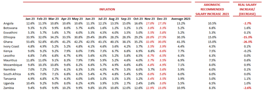 While the normal practice is not for the employer to “make good” the negative real salary increase in 2024, cognisance should be taken of the erosion of the Ethiopian and Ghanian employee’s net pay in 2023, if possible.
